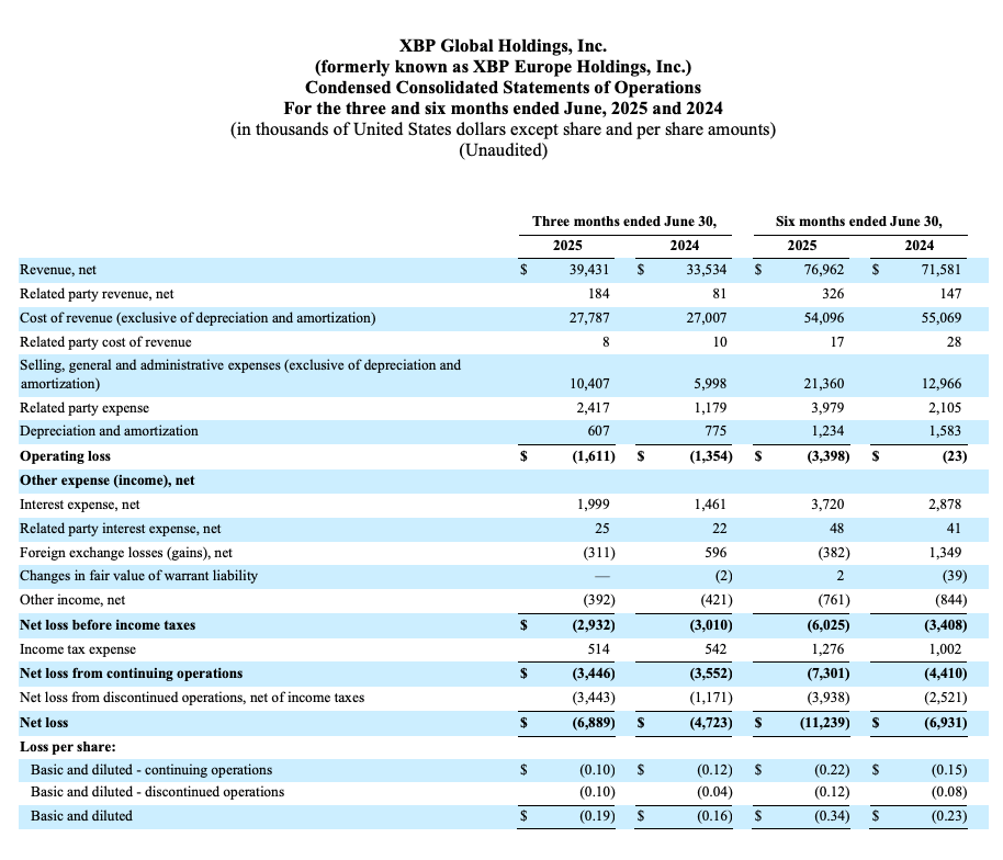 IRVING, TX AND LONDON, UK, August 14, 2025 (GLOBE NEWSWIRE) – XBP Global Holdings, Inc. (“XBP Global” or “the Company”) (NASDAQ: XBP), a multinational leader in business process automation and integration of bills, payments, and related solutions and services seeking to enable the digital transformation of its clients, announced today its financial results for the quarter ended June 30, 2025. These results reflect those of XBP Europe prior to the previously announced acquisition of BPA.